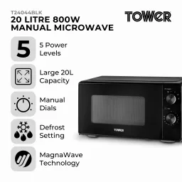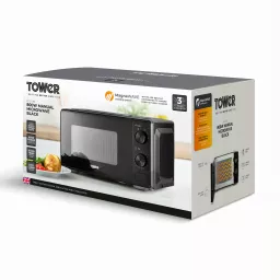 Effortlessly cook everyday meals for the family to enjoy with this 20L Manual Microwave from Tower. Powered by Magnawave technology, concentrated waves circulate around the chamber, ensuring heat is evenly distributed for well cooked meals every time. It has five power levels and an 800W output that can be adjusted to suit your cooking needs. Simply adjust the power level or timer via the dial controls for fuss-free cooking. The spacious 20L capacity can easily accommodate a 10” dinner plate so you can easily use larger dishes to create meals for the whole family to enjoy. The 30 minute timer provides plenty of time to cook meals with complete precision, whilst the defrost function allows you to thaw frozen food prior to cooking for easier mealtimes. A high quality glass turntable ensures food is thoroughly cooked, whilst the painted interior requires a simple wipe clean to keep it hygienic and free from leftover food. A simple press button allows you to open the microwave door for easy cooking.