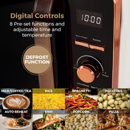 Packed with functionality surrounding elegant rose gold accents, this 800W black 20 litre digital microwave is the perfect appliance for convenient cooking. This trendy microwave is essential for your everyday needs with its 8 autocook settings, including milk/coffee, rice, spaghetti, potatoes, auto-reheat, fish, popcorn and pizzas so you can make your favourite meals at the touch of a button. Featuring 6 power levels, you can adjust to heat up your dinner in a matter of minutes which includes a defrost function, allowing you to cook from frozen and meeting to your busy schedule for quick, easy food. Its huge 20 litre capacity means you can accommodate a standard 10-inch plate without hassle, and with its additional high quality turntable, heat is evenly distributed to ensure your food is cooked thoroughly.