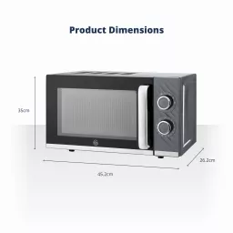 The Swan Windsor 20L Manual Microwave is stylish yet simple. Featuring manual dial controls, 5 power levels and 30 minute timer, whether you’re warming soup, cooking jacket potatoes or heating up a ready meal, you get full control over your mealtimes. If you need to thaw something fast, simply use the time defrost function to get accurate results without overcooking. It’s also the perfect family size microwave, with a 20L capacity that fits a 10-inch dinner plate—perfect for meals, quick lunches or snacks but compact enough that it won’t take up much room on your worktop. Additional features include non-slip feet, audible cooking alerts, and removable glass tray, making it user-friendly and easy to clean. Stylish yet affordable, this 800W microwave brings together performance, safety and convenience for everyday life. Matching Swan Windsor kettle and toaster available.