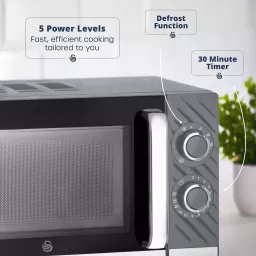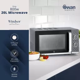 The Swan Windsor 20L Manual Microwave is stylish yet simple. With 5 power levels and 30 minute time, it’s perfect for everyday use in busy households. You can either defrost by time, quickly heat your leftovers, or cook from scratch effortlessly. It’s also a great family size microwave, with enough space to fit a full dinner plate, yet it won’t take up much room on your worktop. Matching Swan Windsor kettle and toaster available.