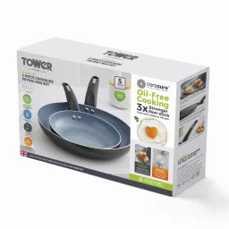 Enhance your cooking experience with the beautifully designed 2 piece Cerasure fry pan set from Tower. Comprising 20 and 28cm fry pans, you can now create a whole host of delicious home cooked dishes, ideal for solo or all the family. Featuring Cerasure ceramic non-stick coatings and pressed aluminium bodies, these pans are lightweight, easy to clean and provide virtually oil free cooking, so you can create delicious healthy dishes for you or all the family to enjoy. The bonded stainless steel base ensures even heat distribution throughout cooking, making them suitable for all hob types. Cool soft touch ergonomic handles provide added comfort and control for more efficient performance. This 2 piece frying pan set comes with your standard 1 year warranty, with an additional 9 years available if you register the product within 28 days of purchase.