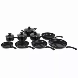 Comprising 16cm, 18cm and 20cm pans, this 3-piece Essentials pan set is ideal for creating all types of meals. Constructed from sturdy heat-resistant pressed aluminium with black non-stick inner coating, the pans in this set are complete with tempered glass lids, each equipped with an innovative and convenient spoon-resting handle. At once sturdy and comfortable to carry, thanks to their ergonomic stay-cool handles, the pans in this set are suitable for all hob types and require only a simple hand-wash to clean, making them a practical as well as useful addition to your kitchen.
