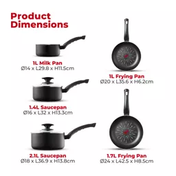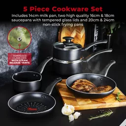 This 5 piece cookware set offers great versatility with 20cm/24cm frying pans, a 14cm milk pan and 16cm/18cm saucepans. Presenting innovative SmartStart technology with a built-in temperature sensor that lets you cook like a Pro