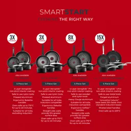 This 5 piece cookware set offers great versatility with 20cm/24cm frying pans, a 16cm milk pan and 18cm/20cm saucepans. Presenting innovative SmartStart technology with a built-in temperature sensor to cook like a Pro. Put the pan onto the heat and wait for the SmartStart tick to change to dark red to start cooking. Each pan is ultra-tough with expertly crafted 3mm thick aluminium. Great heat conductivity properties and lightweight design ensure rapid heat-up and easy manoeuvrability. Straight side walls give 15% more cooking space, ideal for family-sized meals. The innovative Aeroglide non-stick coating is 3x stronger than standard non-stick coatings. The Aeroglide coating provides superior food release, is easy to clean and is dishwasher safe. The pan is oven safe up to 170C for 40 minutes. All SmartStart pans are free from harmful chemicals such as PFOA, Lead and Cadmium. Sustainable materials have been used, with fully recyclable products and packaging. Suitable for all hob types, even induction.