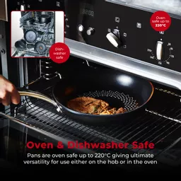 Pans are oven safe up to 220C, thanks to the steel handle, giving ultimate versatility for use either on the hob or in the oven