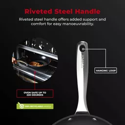 Riveted steel handles offer added support and comfort for easy manoeuvrability. These handles can be used in the oven without a time limit.