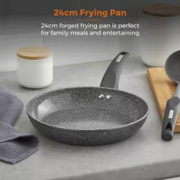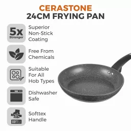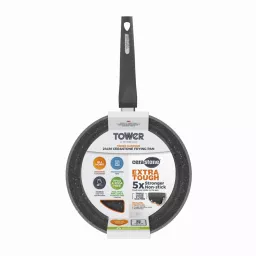 Cook deliciously hearty fry-ups, healthy stir-fry dishes and fluffy pancakes with the Tower 24cm Forged Frying Pan. Featuring high-grade non-stick technology, the Cerastone coating is 5x stronger than other non-stick coatings, and is PFAS, PFOA, PTFE, Lead and cadmium-free so you can enjoy healthy meals using little or no oil. Its high quality, long-lasting forged aluminium body enables quick and easy adjustment of temperatures for more efficient cooking results, with no hot spots. The frying pan has a softtex handle for comfortable control over your cooking. Its bonded steel base provides even heat distribution to ensure your food is cooked thoroughly, and is designed to work with any hob type including induction. The non-stick ceramic coating prevents food from sticking to the surface, and this frying pan is dishwasher safe for an even easier clean after cooking. Collect the full Cerastone range for all your best loved dishes, with 100% recyclable product and packaging.