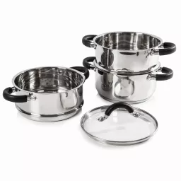 Stylish, efficient and generously-sized, this 3-tier steamer is ideal for preparing vegetables, meat and fish for one person or all the family. An encapsulated base ensures even heat distribution, reducing cooking time whilst also avoiding hot spots, while tempered glass lids provide clear visibility, allowing for more efficient cooking. Its silicone-covered riveted handles make the steamer easy to use and carry, while the encapsulated base ensures even heat distribution and makes it suitable for all hob types including induction, adding versatility. Dishwasher and oven safe for up to 200C, this steamer set is finished with a stainless steel polished finish, making it as attractive as it is practical.