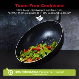 This SmartStart Classic wok is free from harmful chemicals such as PFOA, Lead and Cadmium. The wok is lightweight and ultra-tough thanks to expertly crafted 2.5mm thick aluminium. Great heat conductivity properties and lightweight design ensures quick heat-up time with easy manoeuvrability
