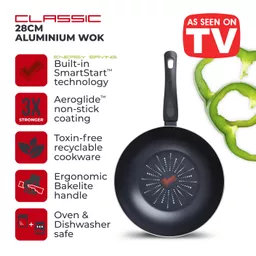 Create deliciously sizzling fajitas and stir-fry dishes with this 28cm Wok. Featuring SmartStart technology, the red tick sensor in the non-stick coating activates at 150C, changing from light to dark red once the optimum temperature has been reached, taking the guesswork out of cooking. The wok is lightweight and ultra-tough with expertly crafted 2.5mm thick aluminium. Great heat conductivity properties ensure quick heat-up time with easy manoeuvrability. Innovative Aeroglide non-stick coating consists of a base layer and durable abrasion layers. The 3-layer coating is 3x stronger than standard non-stick coatings. Aeroglide coating provides superior food release, is easy to clean and is dishwasher safe. The wok is oven safe up to 170C for 40 minutes, allowing for versatility & expansion of recipe ideas. The wok is free from harmful chemicals such as PFOA, Lead and Cadmium. Sustainable materials have been used, with fully recyclable products and packaging. Suitable for all hob types, except induction