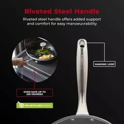 Riveted steel handle offers added support and comfort for easy manoeuvrability. The handle can be used in the oven without a time limit