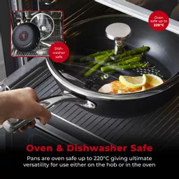 The multi-pan is oven safe up to 220C, thanks to the steel handle, giving ultimate versatility for use either on the hob or in the oven