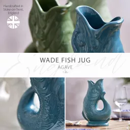 Add a touch of UK ceramic heritage to your home with this 1.2L Fish Jug from Wade. Created using the original iconic Wade design that continues to delight homes across the world for over 150 years. This fish jug is the perfect statement piece for any home. Handcrafted in Stoke-on-Trent, the heart of the pottery industry using English Earthenware, it showcases and celebrates exceptional craftmanship. The 1.2L capacity means you can use it as a water jug or wine carafe at family mealtimes or social gatherings, while also being the ideal ornament, vase or table centrepiece, it just oozes style. The unique gurgling sound has long been a hallmark for the jug and it will produce the sound when pouring the jug if it is at least three quarters full. Formed in the shape of a fish, the mouth perfectly lines up to create an easy pour spout, whilst the tail curves up to create an ergonomic handle with a comfortable grip. It is the perfect gift for any heritage brand lover and would be great for weddings, birthdays and housewarming parties. Handwash is recommended to maintain the glaze and to keep the jug looking its best.