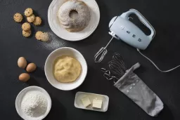 Ideal for both sweet and savoury preparations, thanks to the three different types of whisks included. Two wire whisks, for airier textures such as whipped cream; two flat whisks, ideal for semi-hard doughs such as biscuits and cake bases; and two dough hooks for leavened products such as pizza or bread. The SMEG fabric case can then be used to store away all of these accessories, in style.The control panel is embellished with a backlit LED display, ready to show off your speed selected and the time of use. For maximum flexibility, there are up to nine speed levels to choose from and a turbo function which is ideal for heavy mixtures. The clever smooth start action also keeps dry ingredients from escaping the bowl, so you don't end up covered in flour! Featuring an ergonomic anti-slip handle, a rapid release trigger to easily remove the accessories, and a self-balancing design with non-slip feet so your mixer can rest securely.