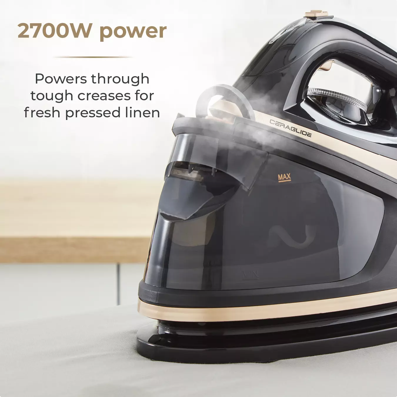High-performance Ceraglide iron with a non-stick, scratch-resistant ceramic soleplate for an effortless glide across fabrics and 30% faster ironing