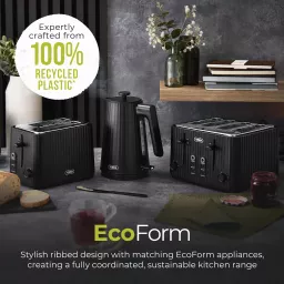 The Tower ECO 900W 4 Slice Toaster is the sustainable choice for your breakfast routine. Crafted from 100% recycled plastic, it pairs stylish ridged design with practical features. Independent dial controls with 6 browning levels and self-centring slots deliver perfectly even results, while defrost, reheat, and cancel functions give you total control. Illuminated LED lights make it easier to see in rooms with low light. A removable crumb tray, cord storage, and non-slip feet keep worktops clean and tidy. Complete the look with the matching ECO range for a co-ordinated, eco-friendly kitchen