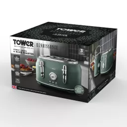 Enjoy toast to your taste every breakfast time with the Tower Renaissance 4 Slice Black Toaster. With its durable body and removable crumb trays, this is the ideal long-lasting kitchen essential that perfectly toasts bread, crumpets and bagels.