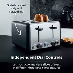 Independent controls on the front of the toaster will let you cook bread, bagels and crumpets at different times and temperatures