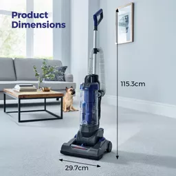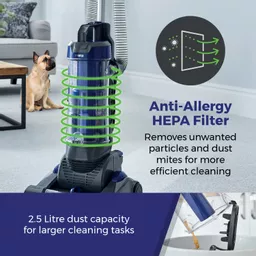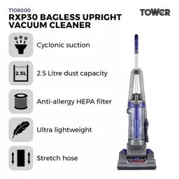 Providing an efficient clean up throughout the home, this Tower TXP30 bag-less upright vacuum cleaner features cyclonic suction technology to provide an enhanced vacuuming performance. The 750W motor uses 100W of suction power to easily retrieve unwanted dust and dirt, producing fresh and clean carpets, upholstery and hard flooring. Enjoy uninterrupted cleaning with the large 2.5 litre dust capacity that is detachable, allowing you to dispose of the dust once full. The integrated HEPA filter collects unwanted dust and pet dander, to ensure a comfortable and cleaner living environment for those who suffer with allergies. Its ultra-lightweight body makes it effortless to move the vacuum from room to room all around the home while the 2-metre stretch helps you to target dust on the ceiling and above doorframes without strain.