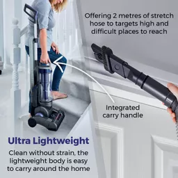 Offering an impressive 2 metres of stretch hose, you can target places difficult to reach, across the ceiling and above door frames to combat dust collection