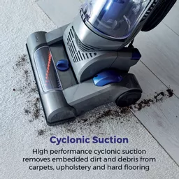 With an intense 750W output, the powerful enhanced cyclonic suction effortlessly removes debris and deep embedded dirt, producing fresh and clean carpets, upholstery and hard flooring for versatility